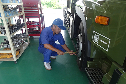自社のトラクターヘッドやトレーラーの整備を行います。使用する設備は最新のものを導入しているので、快適に整備できます。